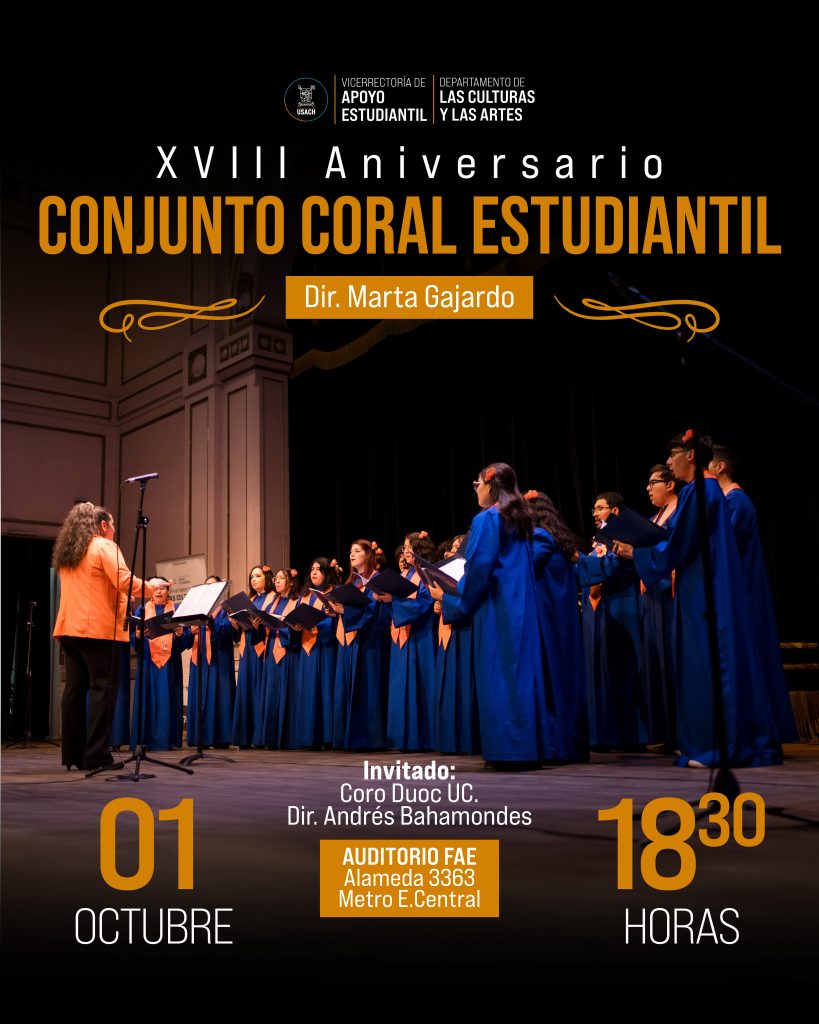 El miércoles 1 de octubre a las 18:30 horas en el Auditorio FAE, el Conjunto Coral Estudiantil Usach celebrará 18 años de trayectoria con un concierto que contará con la participación especial del Coro Duoc UC.