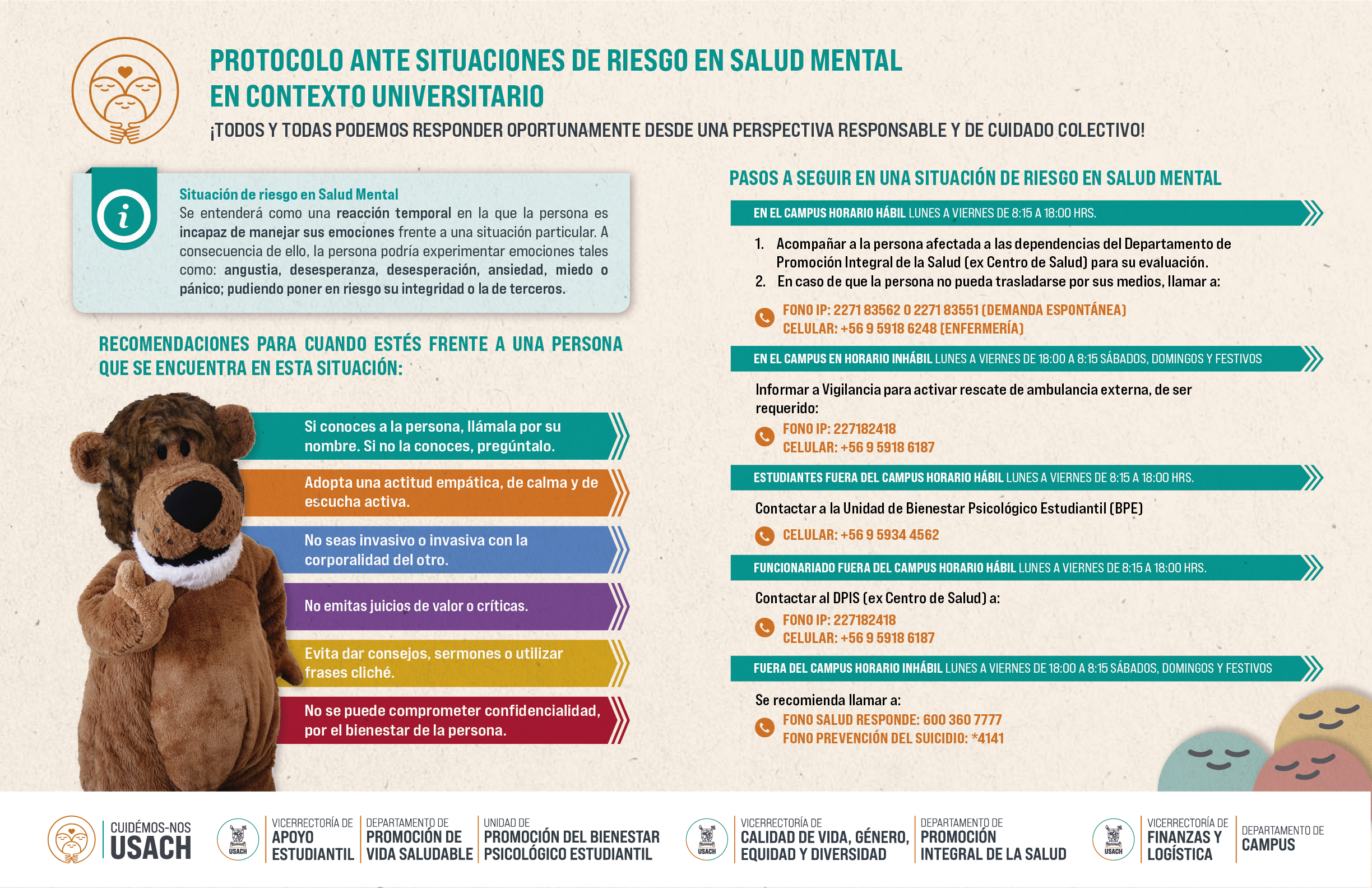El protocolo entrega una orientación clara para el correcto abordaje en situaciones de crisis en materias de Salud Mental estableciendo un mecanismo único de respuesta coordinada ante situaciones de riesgo fuera y dentro del campus.