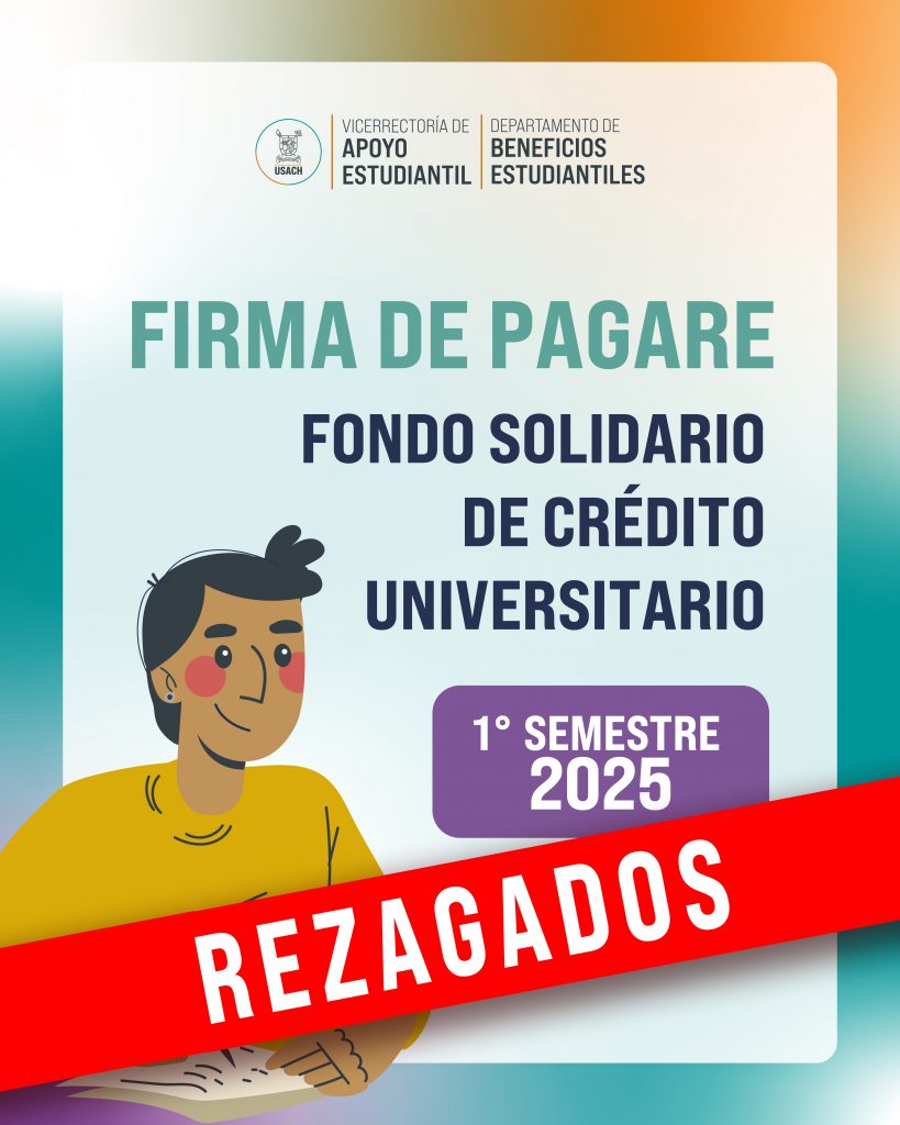 Este miércoles 2 de julio, se habilitará la opción de firmar el pagaré para rezagados, para quienes fueron favorecidas o favorecidos con el Fondo Solidario del primer semestre 2025. Para realizar el trámite, ya sea si eres alumno nuevo o antiguo, deberás acercarte de manera presencial en el primer piso de la VRAE, entre las 09:15 y 12:15 horas.