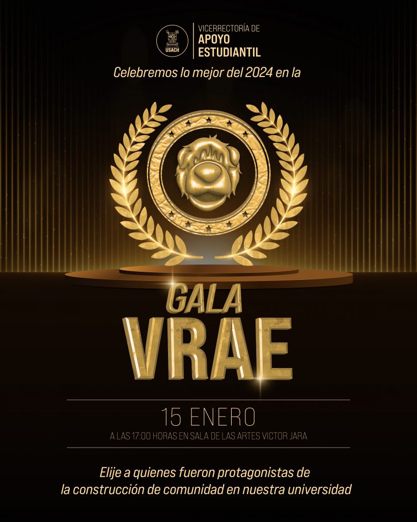 La Vicerrectoría de Apoyo Estudiantil celebrará su cierre de año el próximo 15 de enero de 2025 con la “Gala VRAE”. El evento, que tendrá lugar a las 17:00 horas en la Sala de Artes Víctor Jara, marcará un hito significativo, ya que premiará a la comunidad estudiantil y las iniciativas más destacadas desarrolladas por el estamento durante el año 2024. La ceremonia brindará una oportunidad única para reconocer y valorar los logros de quienes han realizado contribuciones clave para el bienestar y desarrollo de la universidad.